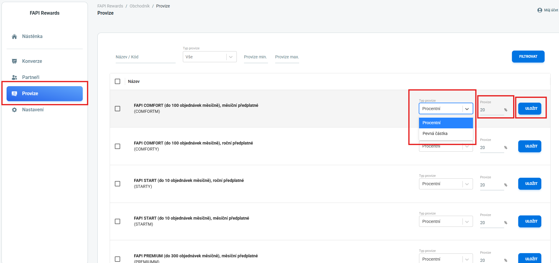 - U každého produktu nastavte procentuální nebo pevnou výši provize, kterou partner získá po zaplacení objednávky.