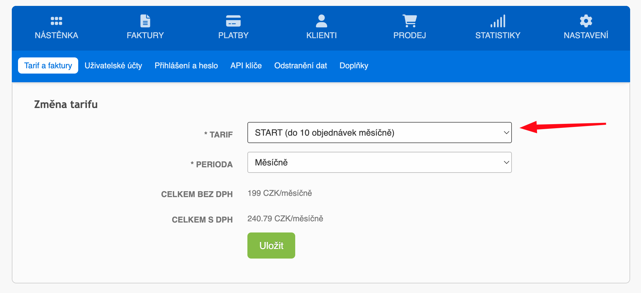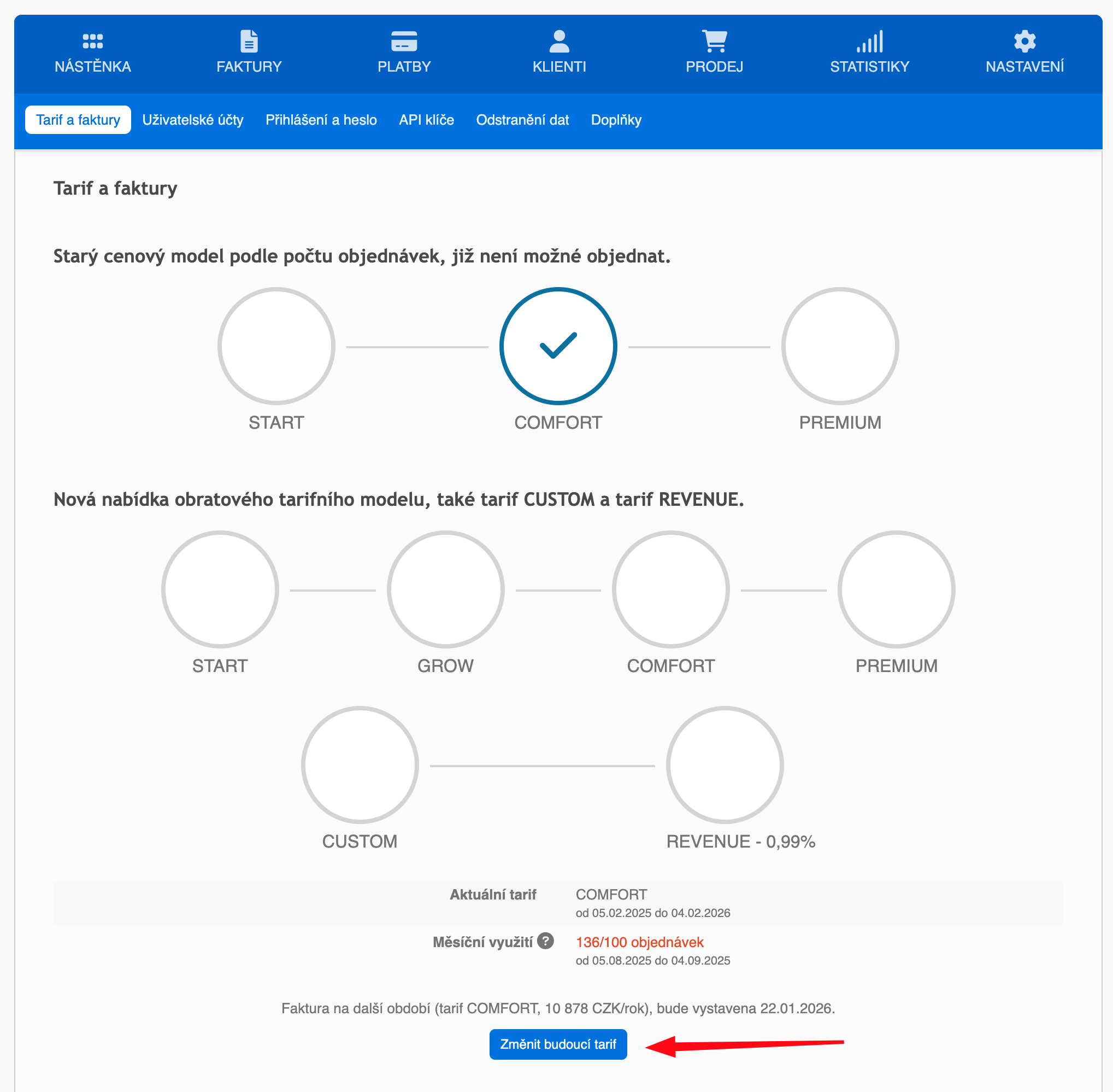 Svůj budoucí tarif pro FAPI si můžete změnit sami přímo v administraci.