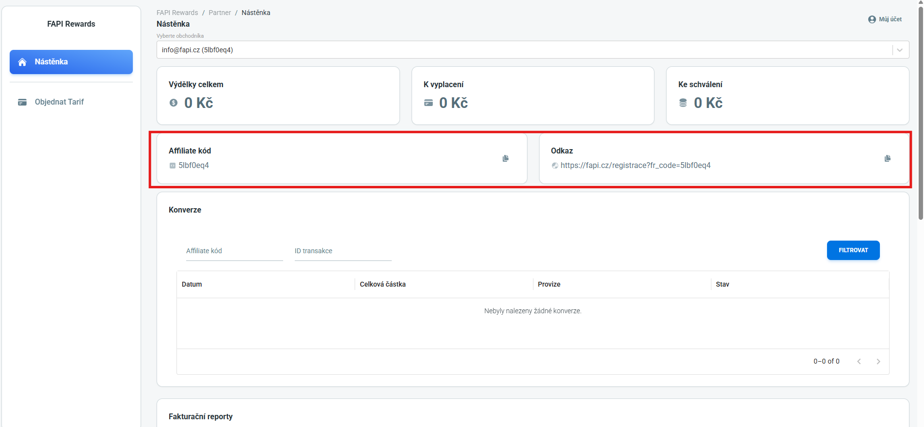 Na nástěnce se zobrazuje váš osobní affiliate kód, který můžete sdílet. Každý nový uživatel, který se přes tento odkaz zaregistruje a začne FAPI používat, vám bude generovat odměnu – 20 % ze všech plateb za tarif.