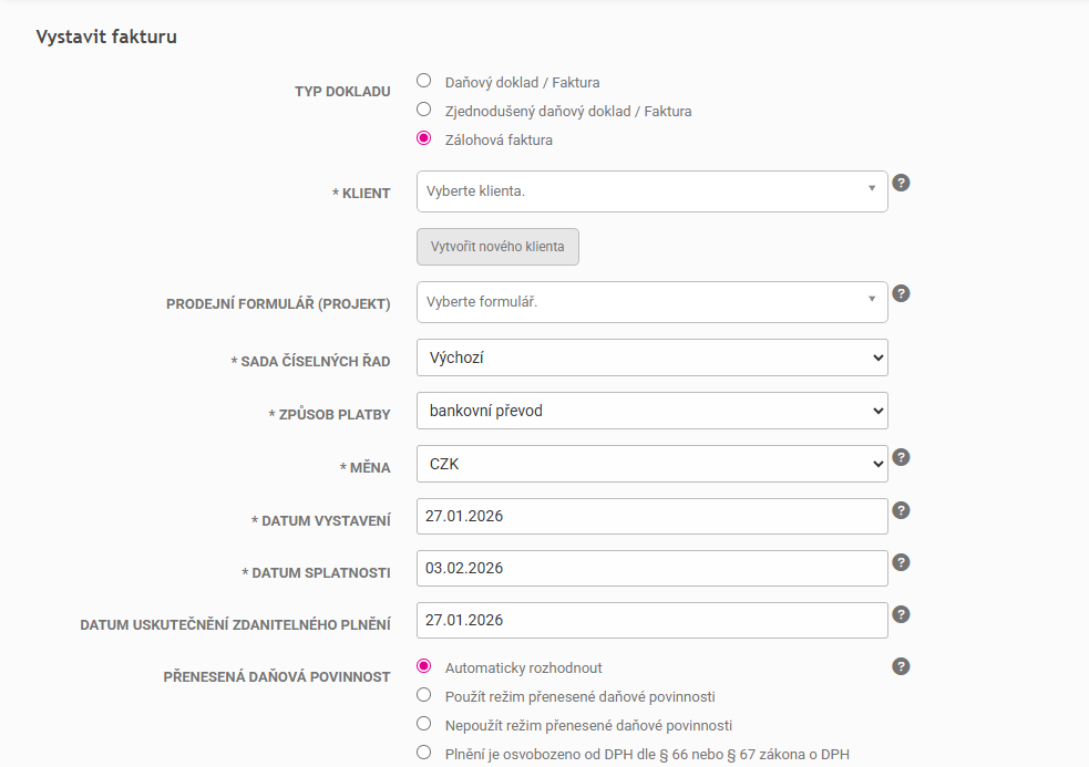 Po kliknutí na tlačítko se dostanete také do administrace tvorby nové faktury.