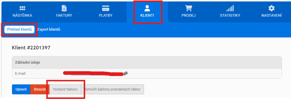 - Pod fakturačními údaji klienta klikněte na tlačítko „Vystavit fakturu“.