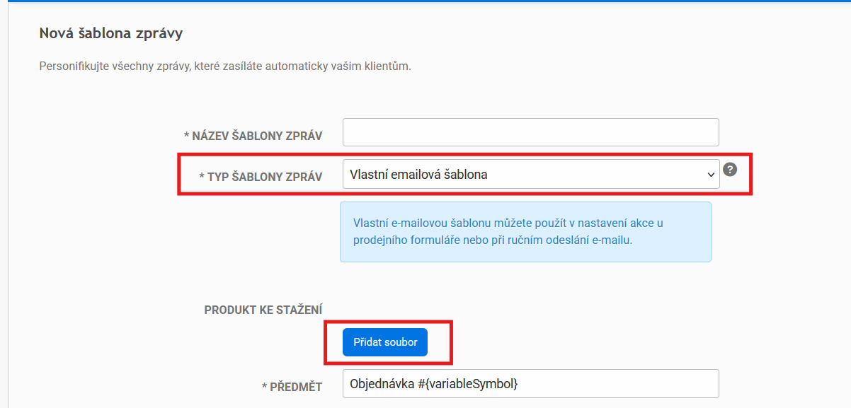 - V dané sadě vytvořte nový email, který bude mít typ Vlastní e-mailová šablona.