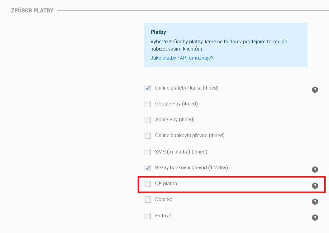 Samotné zapnutí způsobu platby QR kód v prodejním formuláři nestačí.