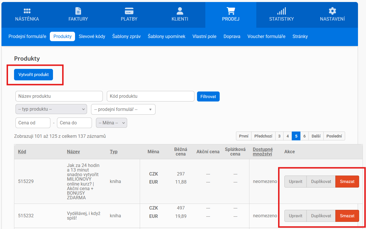 Nabídka PRODEJ - Produkty poskytuje přehled všech produktů a nástroje pro jejich správu. Můžete zde produkty vytvářet, upravovat, duplikovat či mazat, a to pomocí příslušných tlačítek.