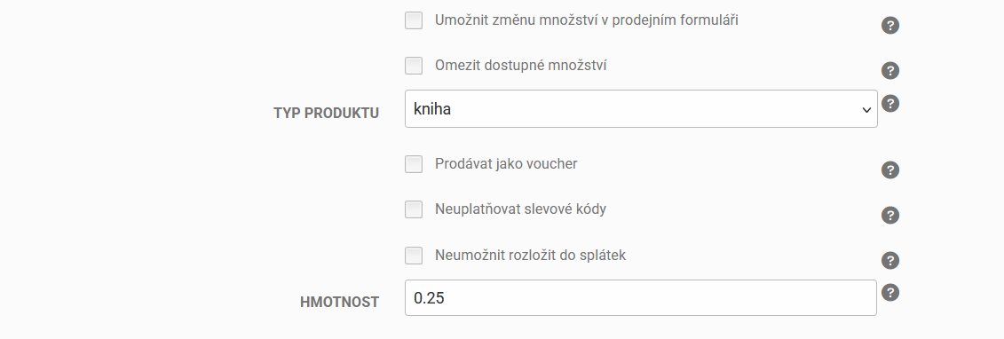 Hmotnost - pole pro zadání hmotnosti produktu se zobrazí pouze u typů, kdy jde o fyzické zboží (tištěná publikace nebo zboží). Zadaná hmotnost produktu slouží pro výpočet hmotnosti zásilky v exportu dat do Zásilkovny. Odpadá tím nutnost hmotnost dopočítávat ručně a vyplňovat v administraci Zásilkovny.