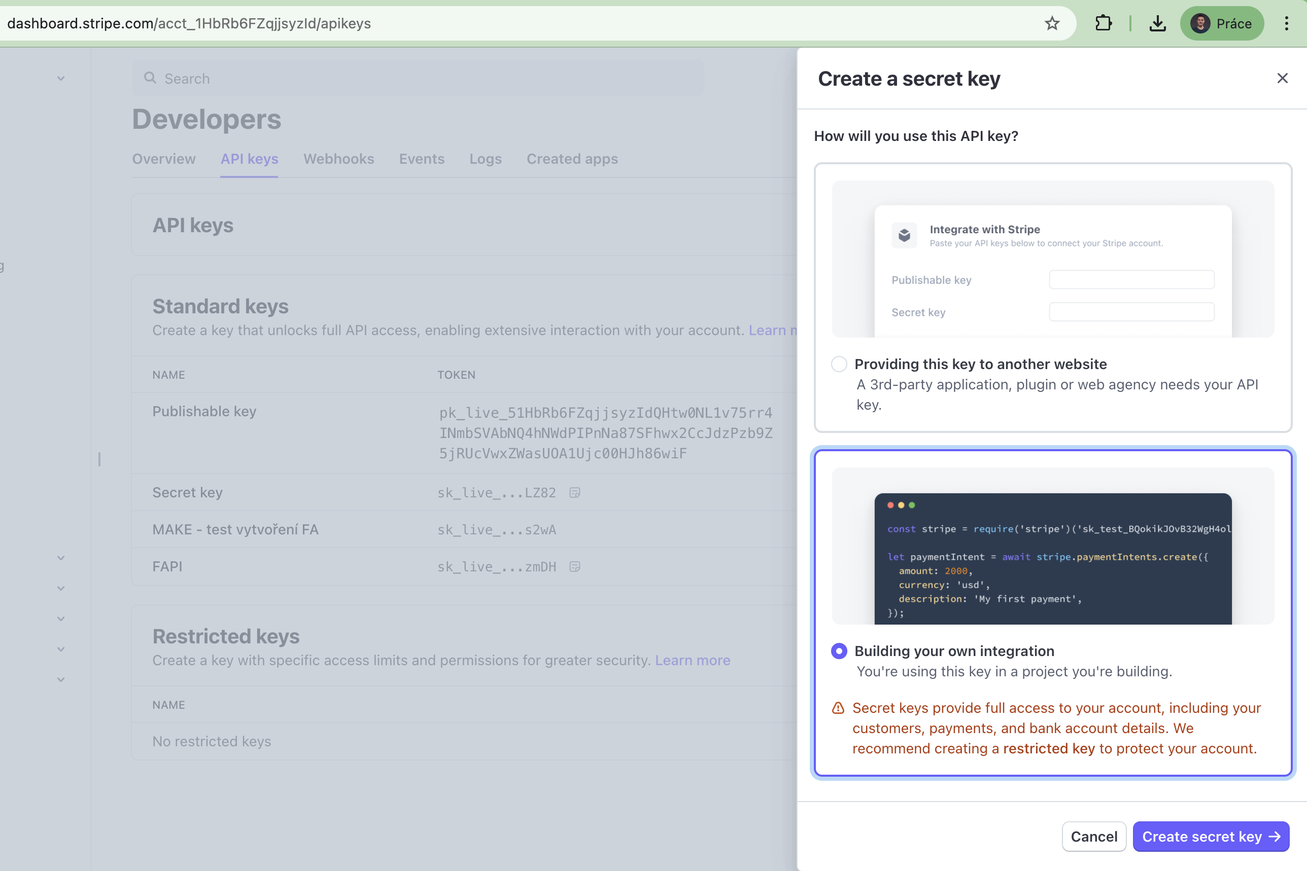 Pokud máte svou platební bránu Stripe připojenou ještě někde jinde, kromě FAPI, pak si pro ně potřebujete vygenerovat unikát Secret Key pro připojení.